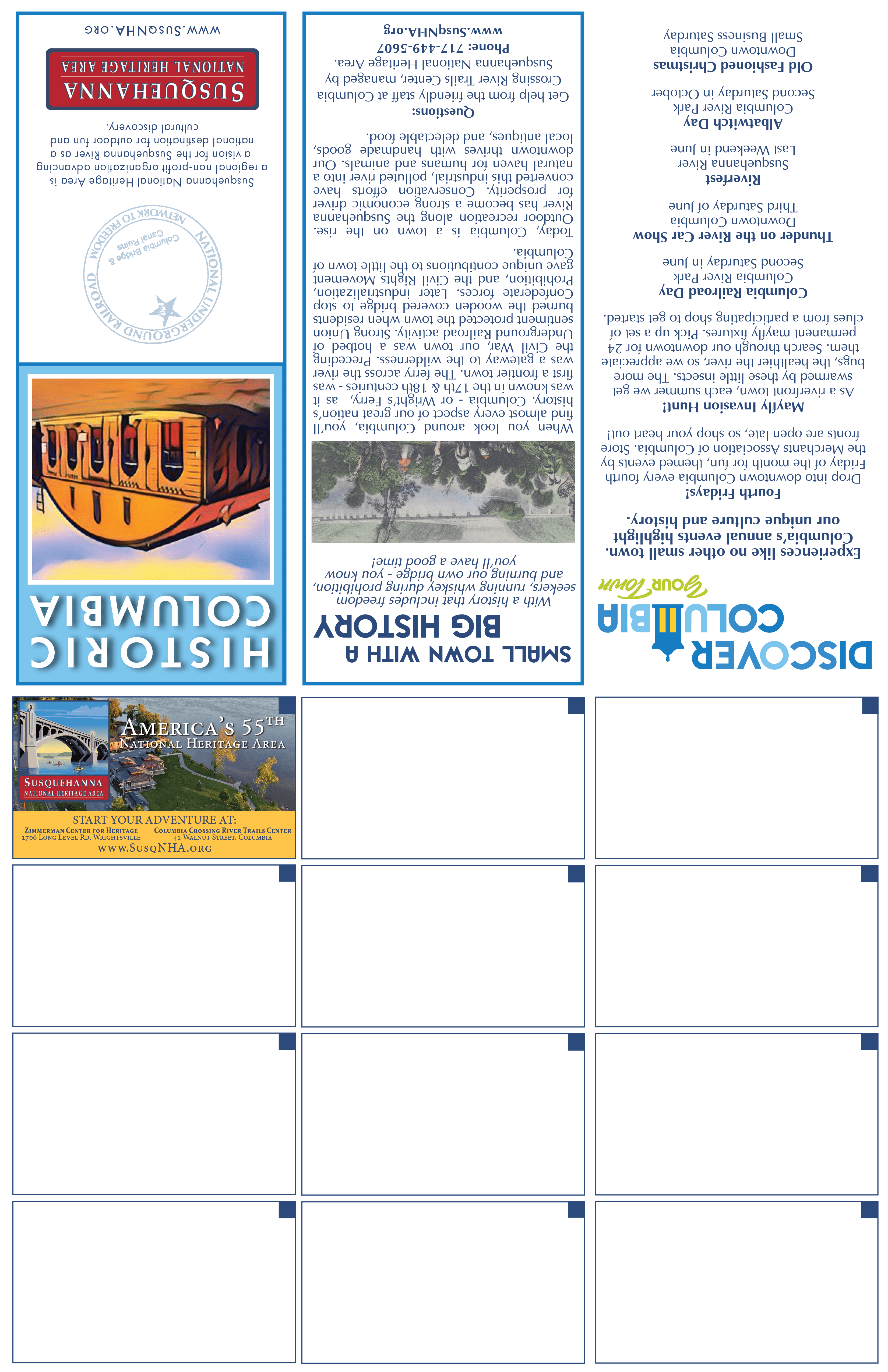 Susquehanna National Heritage Area is updating and reprinting the Historic Columbia map to give to visitors in 2025. This travel map focuses on six primary categories: Food & Drink, Galleries & Boutiques, History & Attractions, Antique & Thrift Shops, Lodging, and Recreation & Parks to help visitors explore Columbia, Pa!